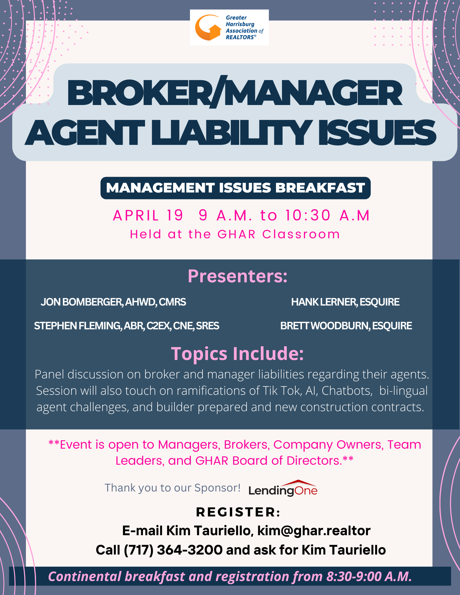 Open to Managers, Brokers, Company Owners, Team Leaders and GHAR Board of Directors Presented by Jon Bomberger, AHWD, CMRS / Stephen Fleming, ABR, C2EX, CNE, SRES / Hank Lerner, Esquire / Brett Woodburn, Esquire