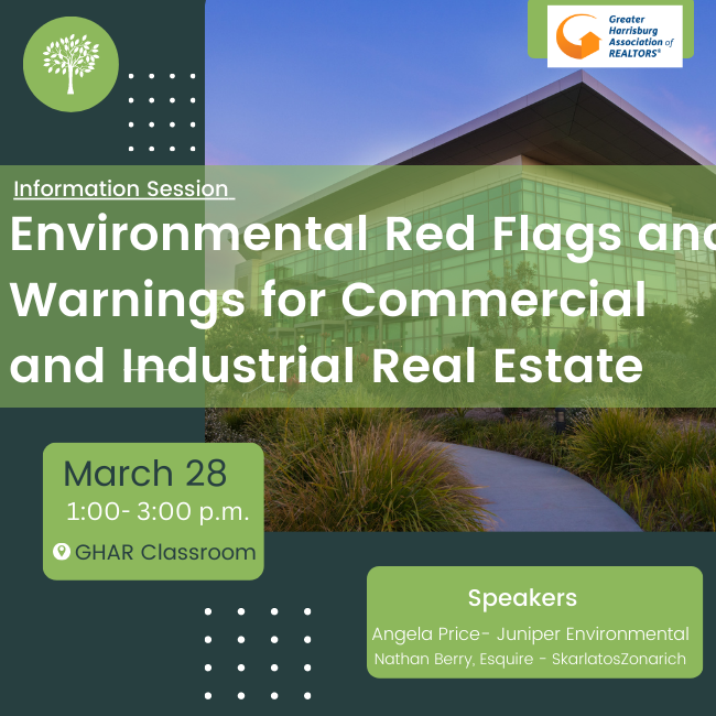 Session will provide information on ways agents and buyers can recognize warning signs and red flags that may be raised in Commercial and Industrial Real Estate for their clients. Speakers: Angela Price, Juniper Environmental and Nathan Berry, Esquire, SkarlatosZonarich