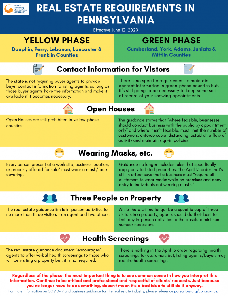 On May 19, the Wolf administration issued new statewide real estate guidance that applies to all real estate transactions in Pennsylvania. Though it’s definitely not “business as usual” for REALTORS®, this new guidance opens up the industry with uniform rules across all markets and eliminates much of the confusing and contradictory information that had been put out in previous documents. Specifically, this completely eliminates the Department of State memo from April 28 and all the confusion it created.